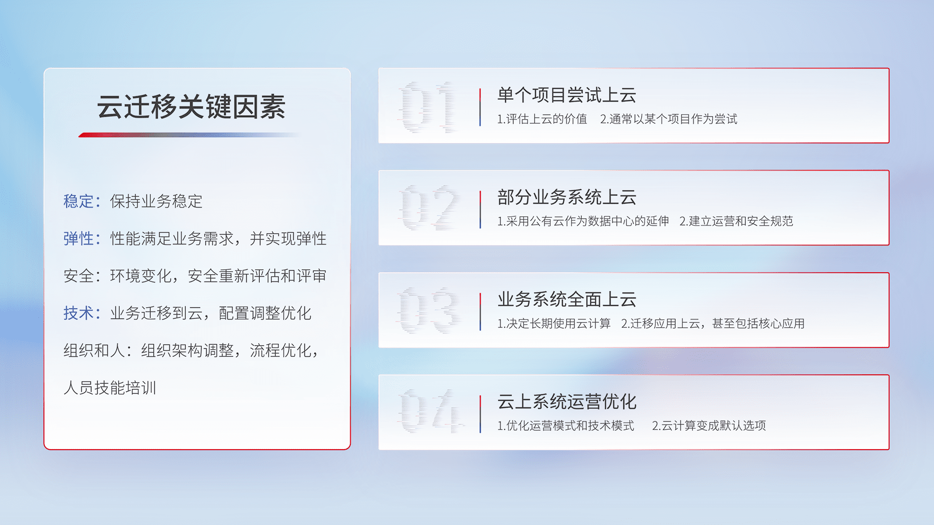 结合实际业务,,,从规划设计、、云平台选型、、云原生改造、、数据迁移、、、集成交付,,,迁移全过程为客户识别最佳上云路径,,,,做好风险识别管理,,,,设计网络架构、、、、身份权限、、安全审计合规、、、、操作审计、、、、日志审计、、、、监控告警策略、、多站点容灾设计等,,对云上基础设施进行整体规划,,提升IT治理水平,,,以满足弹性、、、、高可用、、、、高性能的需求。。。。