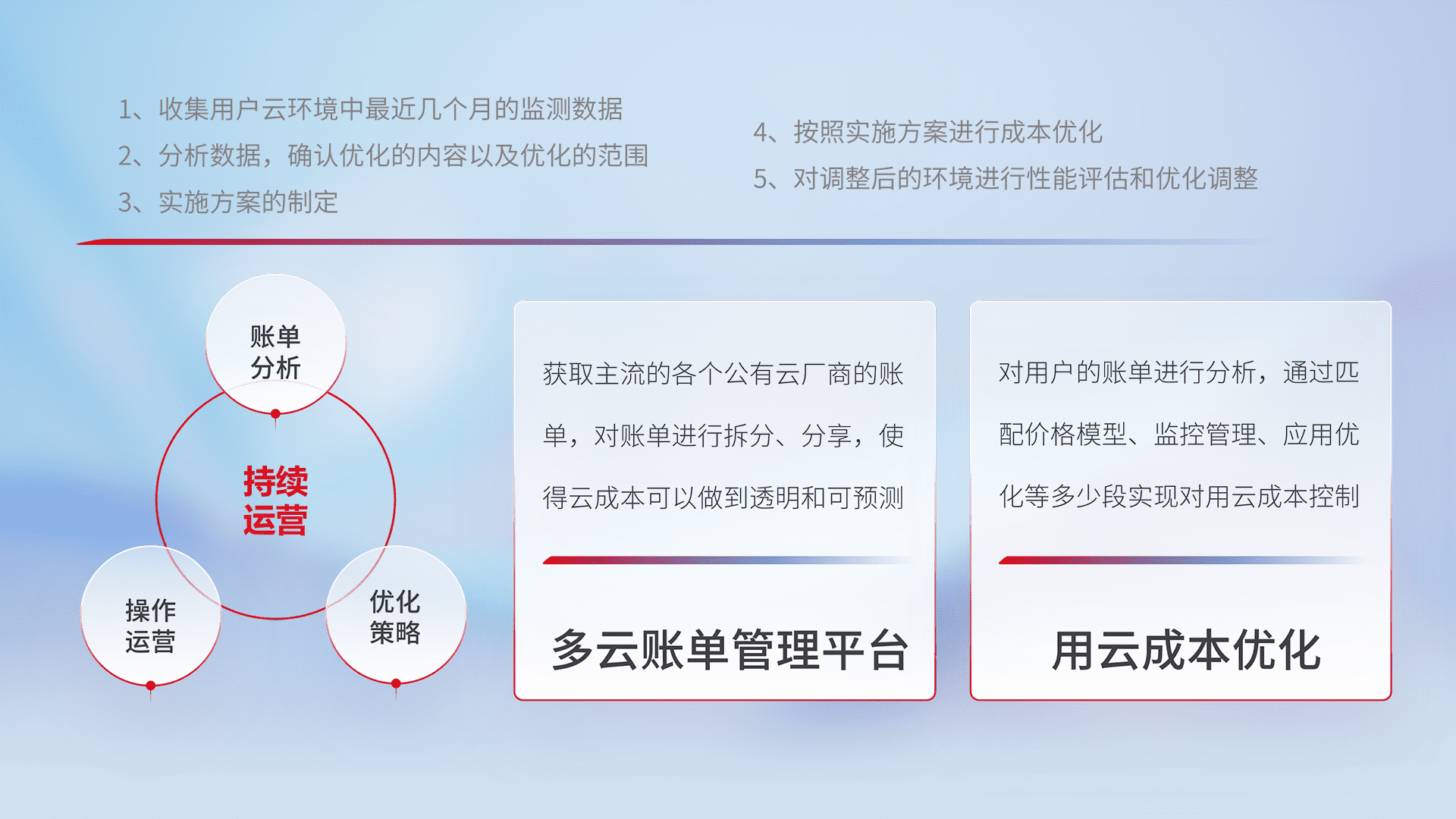 通过灵活运用多种自动化迁移工具,,,,帮助企业用户实现业务和数据高效 、、、、稳定的上云迁移和云上迁移,,,,采用自研多云纳管平台,,以中立管理模式,,解决多组织、、、、多云、、、多运维厂商的复杂关系的管理,,,保证多云平台资源配置的一致性,,,,实时掌控云资源运行数据,,,运用智能化工具分析云资源多云平台的管理服务,,透明化管理成本支出,,用云成本可预测、、用云费用可优化、、、云资源配额有据可依。。。。