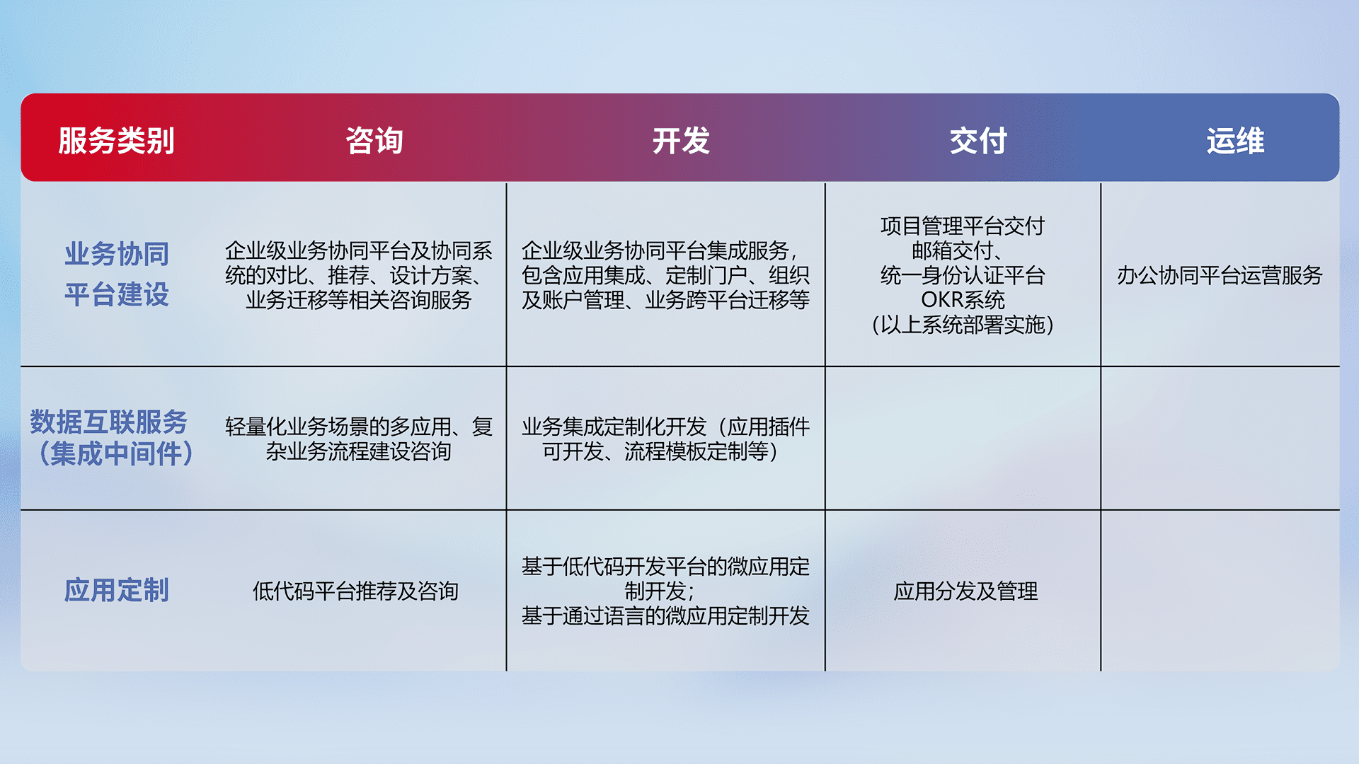 针对钉钉、、企微、、、IDaas等平台级产品提供产品的规划、、、、方案、、、、交付、、定制化开发等服务,,,,实现如统一协同办公、、、智能客户服务、、、、混合会议管理、、、、智能数据查询、、等业务场景,,,,实现数字化转型。。